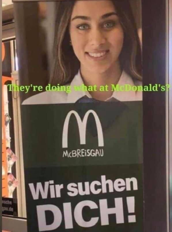 Home You're doing what?! 5 years ago 5 years ago You’re doing what?! by Kelvin 5 years ago5 years ago If you don't speak German, this might seem a little strange.Translated: "We're looking for you!" Post PaginationPrevious PostPreviousNext PostNext image, McDonald's, posterLike it? Share with your friends! 6